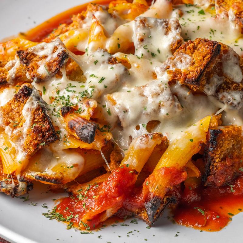 Ziti, ricotta cheese, and meat sauce topped with melted mozzarella and diced eggplant.